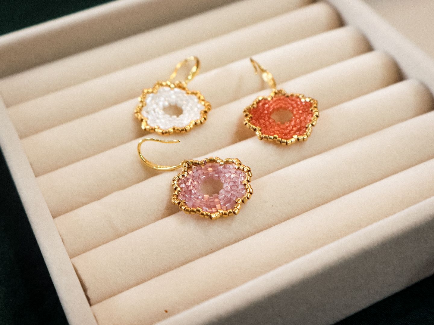 - Materials: Miyuki delica beads, gold-plated hooks