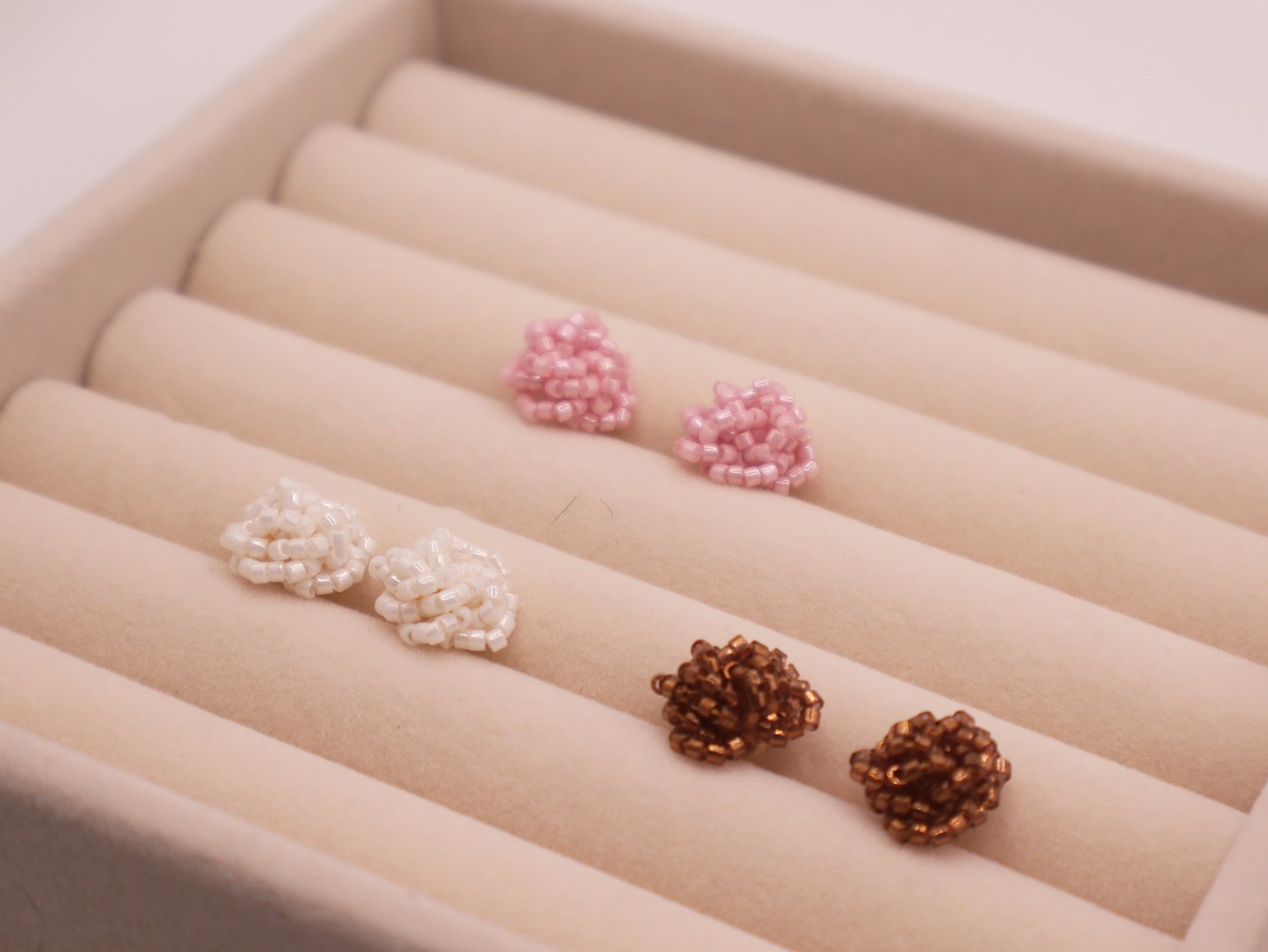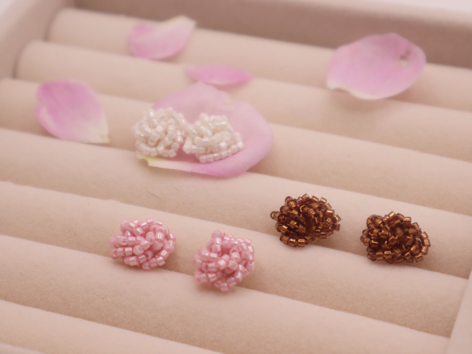 Rosette Studs are crafted from iridescent Miyuki seed beads, woven into soft, petal-like clusters that resemble a blooming rose.